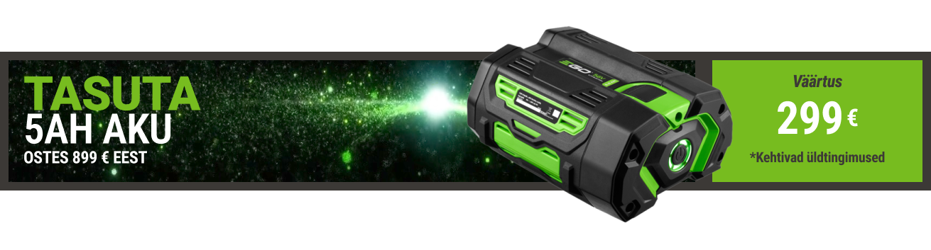 Tasuta 5,0Ah aku (BA2800T) väärtusega 299 €, kui ostate EGO seadmeid ühe tehinguga vähemalt 899 € eest. Eksklusiivne pakkumine kehtib ainult osalevatel EGO volitatud edasimüüjatel alates 01.01.2026 kuni 31.12.2026 või kuni varude lõppemiseni.